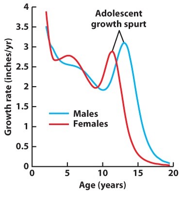 여아는 남아에 비해서 2년 정도 사춘기가 빨리 시작됩니다. 여아는 만 10세를 전후로 140cm 정도에서 사춘기가 시작되고 이후 여자들의 평균키인 161cm에 도달합니다. 남아는 만 12세를 전후로 150cm 정도에서 사춘기가 시작되고 이후 남자들의 평균키인 174cm에 도달합니다. 다시 말해서 성장 속도는 유아기 이후 계속 늦어지다가 마지막 사춘기 34년 기간에 2025cm 정도 자라고 성장이 멈추는 것을 알 수 있습니다.