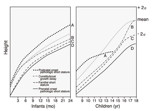 | 유형 B | 키와 체중이 출생 시에는 정상 -> 1세 말에 성장 속도가 저하되어 표준 이하 -> 성장 곡선의 하단을 따라 성장 -> 사춘기 말기에 급속 성장 -> 정상체중/키 - 유전적 : 가족력 존재 - 2차 성징 출현 지연, 골연령이 역연령에 비해 지연 | 체질성 성장 지연 |