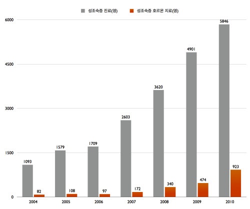 위 그래프는 인제대학교 상계백병원 소아청소년과에서 2004년에서 2010년까지 성조숙증 진료를 받은 8세 미만 여아와 9세 미만 남아 2만1351명을 분석한 결과입니다. 성조숙증 때문에 진료를 받은 인원들 중에서 실제로 성조숙증로 확진된 비율은 10%에 불과했습니다.
