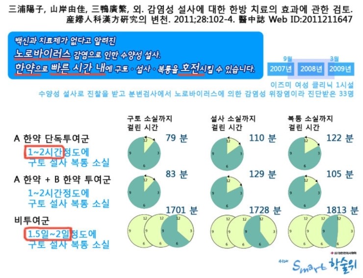 아래 논문은 2011년에 일본의 학술지에 실린 '감염성 설사에 대한 한방 치료의 효과에 대한 검토'라는 논문입니다.