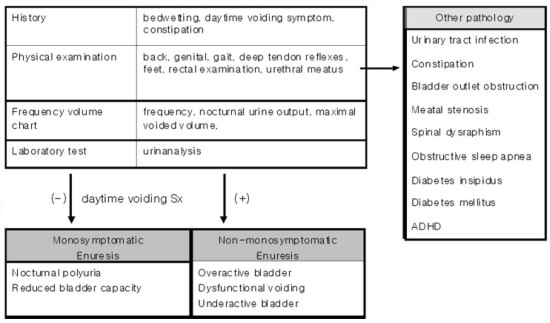 야뇨증을 진단하는데 있어서 낮에 오줌을 눌 때 이상 증상이 동반되어 있는지를 알아보는 것이 중요합니다. 빈뇨(하루 8회 이상), 급박뇨, 요실금, 쪼그려 앉기 등은 방광이 예민하다는 증거이며 방광의 기능 용적에 문제가 있을 수 있음을 암시합니다. 변비나 유분증(만 4세가 되어서도 대변을 가리지 못하는 현상)이 있는지, 이전에 요로감염에 걸린 적이 있는지 알아보는 것도 중요합니다.