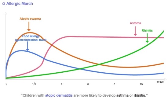 아토피 피부염은 '알레르기 행진(Allergy march)'의 시작점입니다. 어릴 때 아토피 피부염을 앓으면 성장하면서 천식, 알레르기 비염으로 이어지며 '알레르기 행진'이 진행되는 경우가 많으므로 각별한 주의와 관리가 필요합니다.