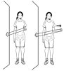 고무줄을 문고리에 묶어서 고정을 합니다. 팔꿈치를 몸에 붙이고 팔을 앞으로 향하게 한 상태에서 팔꿈치를 90도로 유지합니다. 팔을 바깥으로 돌리고 최대한 외회전 한 상태에서 3초간 유지한 후 다시 원위치로 돌아옵니다. 10~15회 반복합니다.