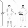 고무줄을 문고리에 묶어서 고정을 합니다. 팔꿈치를 몸에 붙이고 팔을 약간 바깥쪽으로 향하게 한 상태에서 팔꿈치를 90도로 유지합니다. 팔을 안쪽으로 돌리고 최대한 내회전 한 상태에서 3초간 유지한 후 다시 원위치로 돌아옵니다. 10~15회 반복합니다.