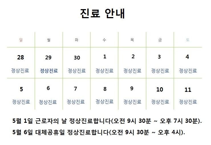 금맥한의원 5월 근로자의 날 및 어린이 날 진료안내2019-04-27카테고리 241원본 보기 ← 이전 글화곡역한의원 금맥한의원 2019년 설날 연휴 진료안내다음 글 →화곡역한의원 금맥한의원 추석 연휴 진료안내같은 카테고리 글2026-02-12금맥한의원 2026년 설연휴 진료안내2025-10-01금맥한의원 2025년 추석연휴 진료안내2025-01-10금맥한의원 2025년 설연휴 진료 안내← 전체 글로 돌아가기