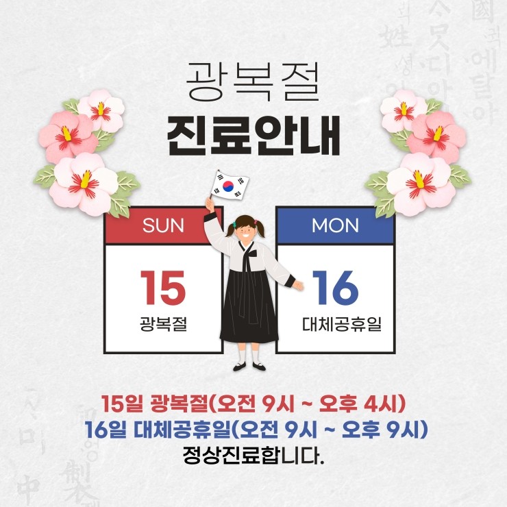 금맥한의원 2021년 8월 광복절 진료 안내2021-08-10카테고리 241원본 보기 ← 이전 글금맥한의원 2021년 5월 석가탄신일 진료 안내다음 글 →금맥한의원 2021년 추석 진료 안내같은 카테고리 글2026-02-12금맥한의원 2026년 설연휴 진료안내2025-10-01금맥한의원 2025년 추석연휴 진료안내2025-01-10금맥한의원 2025년 설연휴 진료 안내← 전체 글로 돌아가기